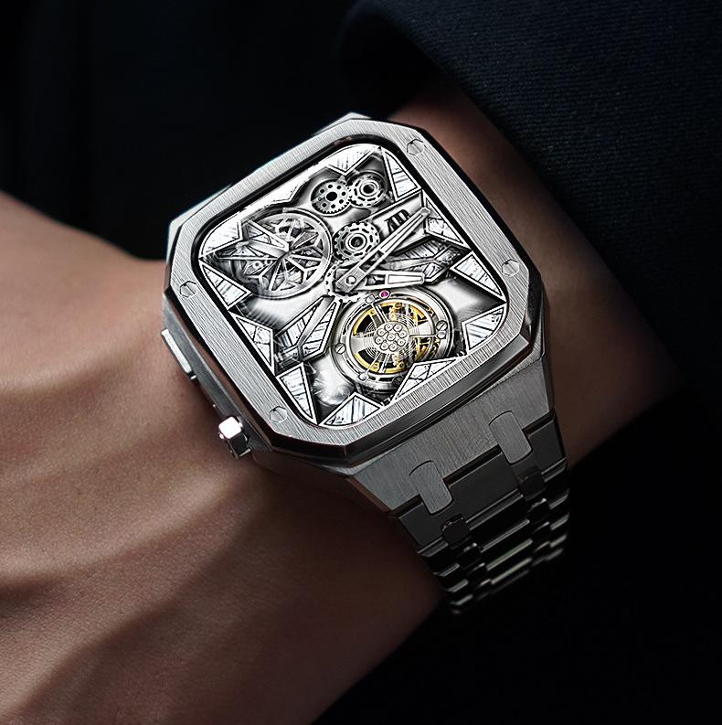 Engineered for seamless integration, the solid steel case and bracelet transform your Apple Watch into a bold statement of mechanical luxury.